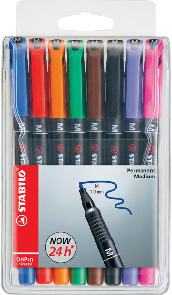 PERMANENT MARKER KÉSZLET 1MM, STABILO OHPEN M, 8 KLF. SZÍN Eredetileg írásvetítőkhöz kifejlesztett filctoll alkoholos tintával, csúszásmentes fogózónával. Szinte minden sima felületen alkalmazható, így minden jelöléssel kapcsolatos feladathoz ideális eszköz. 3 vonalvastagság – szupervékony (S: 0,4 mm), vékony (F: 0,7 mm) és közepes (M: 1 mm). Akár 3 napig kupak nélkül