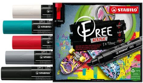 A STABILO FREE Acrylic Marker termékcsaláddal szinte korlátlanul tervezhet és személyre szabhat. A markerek három, gondosan kiválasztott tokváltozatban és akár 20 borítószínben kaphatók. Átlátszatlan és fényálló pigmentált akrilfesték, amely szinte minden felületre alkalmas, a papírtól a kőig a kerámiáig, műbőrig és fáig. Mindenki szabadjára engedheti kreativitás