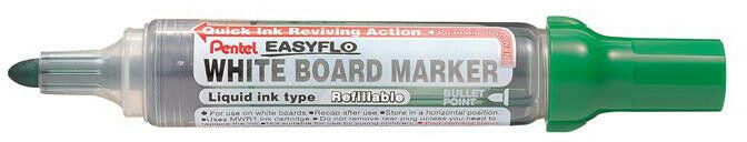 Táblamarker, 6 mm, kúpos hegy, PENTEL "Easyflo", zöld A folyadéktartálynak köszönhetően folyamatos a tinta áramlás és soha nem szárad ki. -gömbhegyű, vízbázisú táblamarker -használat előtt rövid ideig tartsa heggyel lefelé a markert -utántölthető -acryl szálas, mindig alaktartó és strapabíró hegy -93%-ban újrahasznosított anyagból készült, eleme a Pentel Recyolog