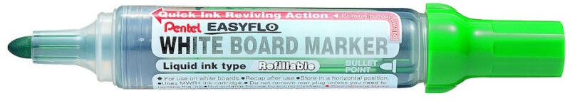 Táblamarker 2mm, kerek, utántölthető PENTEL EASYFLO zöld Gömbhegyű, vízbázisú táblamarker. A Folyadéktartálynak köszönhetően folyamatos a tinta áramlás és soha nem szárad ki. Használat előtt rövid ideig tartsa heggyel lefelé a markert. Utántölthető, patron: MWR1. Acryl szálas, mindig alaktartó és strapabíró hegy. 94%-ban újrahasznosított anyagból készült, eleme