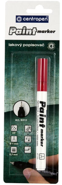 LAKKMARKER 0,7MM, VÉKONY METÁL HEGY CENTROPEN 9211 PIROS Univerzális marker, kerek hegy, 1,5-2,5mm írásvastagság, nem porózus felületeken ír. Száradás után víz -, kopás - és időjárásálló. Katalóguskód: 53494
