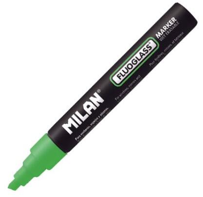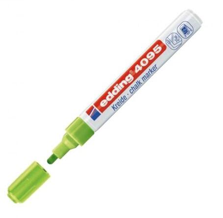 Jelölő sima, nem porózus felületekhez üvegen, táblán, vízálló felületeken és sötét színű kartonon. Könnyen törölhető. Közepes vastagságú ékíró hegy. Vízbázisú folyékony krétával töltve. Szárazon és nedvesen törölhető. Gazdag, élénk színek. Nyomszélesség: 2-4 mm. Szín: zöld.
