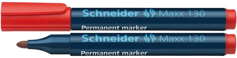 PERMANENT MARKER 1-3MM, KEREK VÉGŰ SCHNEIDER MAXX 130 PIROS Kerek hegy, vízálló szinte szagtalan, gyorsan száradó, minden sima felületre használható, a kupak színe megegyezik a tinta színével. Kupak nélkül 2-3 napig nem szárad be. Katalóguskód: 36335