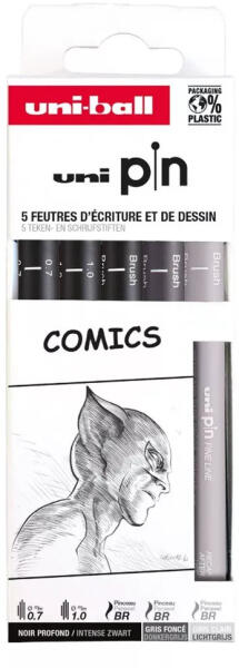 UNI PIN 5 darabos rajzmarker készlet Comics (Brush Light Grey, Brush Dark Grey, Brush Black, fekete rajzmarker: 0,7/1,0 mm) A készlet kiváló művésztollakat tartalmaz (különböző vonalvastagságok). A finelinerek fakulásálló Super Ink tintát tartalmaznak, így alkotásaid tartósak maradnak. A finom hegyű toll homogén, tömör és tiszta vonalat hoz létre. A létrehozott vonalak sz