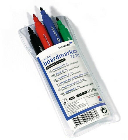 Táblamarker Legamaster TZ111 vékony 4 db-os klt. Szárazon törölhető, újratölthető, fényálló és gyorsan száradó mini táblafilc, műanyag testben. Kúpos hegy, vonalvastagság: 1 mm. Színek: fekete, piros, kék, zöld 4 db/csomag