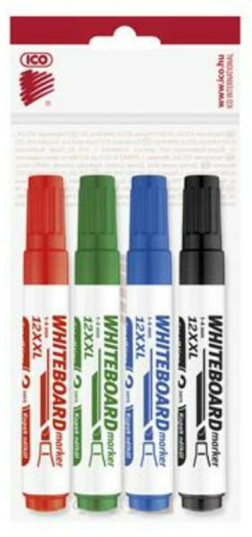 Tábla- és flipchart marker készlet, 1-4 mm, vágott, ICO Plan 12 XXL, 4 különböző szín (TICPL12XV4) Fehér táblára való írásra, rajzolásra alkalmas marker. "Cap-off" festékkel töltve, ezért néhány napig kupak nélkül sem szárad be. Az írás szárazon letörölhető. Megnövelt élettartam a nagyobb méretű testnek köszönhetően. Vágott csúccsal, 4 alapszínben. Vonalvast