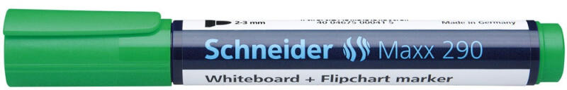 TÁBLA- ÉS FLIPCHART MARKER 2-3 MM KEREK VÉGŰ SCHNEIDER MAXX 290 ZÖLD Univerzális marker flipchart táblákhoz és papíralapú felületekhez, vízálló szinte szagtalan, a fehértáblákról szárazon törölhető, oldószermentes. Kupak nélkül 2-3 napig nem szárad be. Katalóguskód: 36353