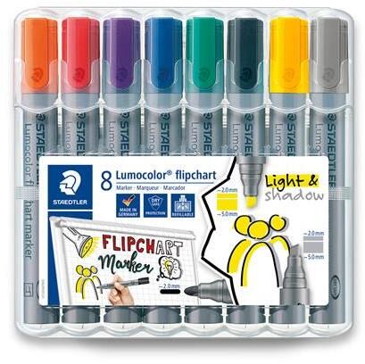 A STAEDTLER vágott hegyű flipchart markereinek színpalettája kiegészüt sárga és szürke színekkel, mindkettõ tökéletes akár szövegkiemeléshez vagy árnyékoláshoz. - tintája nem üt át a papíron - intenzív szín, enyhe illatú - nem hagy foltot, vízálló - gyorsan szárad, így balkezeseknek is ajánlott - "Dry Safe": napokig nem szárad ki kupak nélkül - vízbázisú tinta