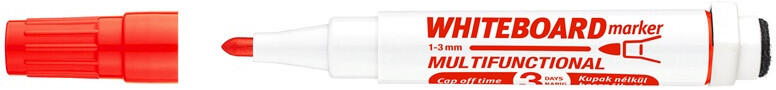 TÁBLAMARKER MARKERASER 3MM MÁGNESES, TÁBLATÖRLŐVEL MULTIFUNKCIÓS PIROS ICO Multifunkciós táblamarker: - mágneses fehértáblára való írásra, rajzolásra. - speciális festékanyagának köszönhetően, néhány napig, kupak nélkül sem szárad be. -a kupakban elhelyezett mágnes révén, acél táblafelületeken rögzíthető. - az írás szárazon letörölhető, melyet a kupak vég