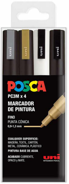 Posca PC-3M marker A készlet színei: ezüst, arany, fehér, fekete Sokoldalú - Színezésre és vonalvezetésre egyaránt használható. Agilis - Golyóhegye és vékony csöve segíti a finom munkavégzést. Vékony - Kiválóan illik ornamentikához és arabeszkekhez. HASZNÁLATA finom hegyű POSCA PC-3M az ínyencek által használt alapvető kreatív eszköz. Pontos, biztos vonással testre