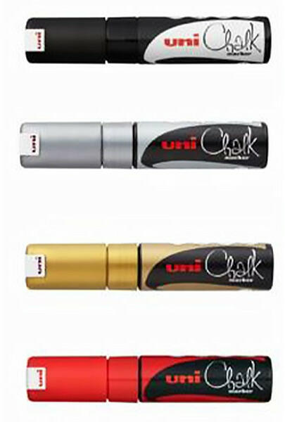 Folyékony kréta UNI PWE-8K alap szett 4-es készlet (fekete, arany, ezüst, piros) Vízbázisú krétamarker, száradás után vízálló, de nedves törlőkendővel könnyen eltávolítható.