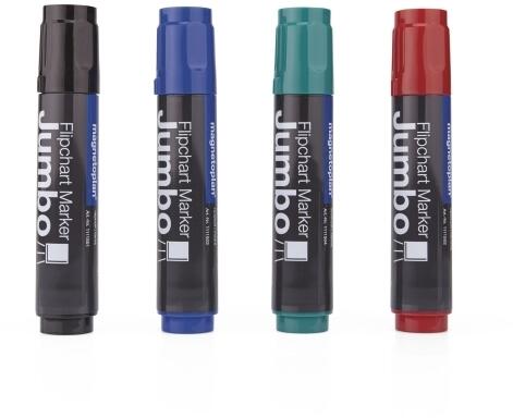 Ez a Magnetoplan JUMBO markerkészlet mindenféle flipchart papírhoz és mágneses írható táblákhoz készült. Összesen 4 darab színes jelölőt tartalmaz - fekete, zöld, kék és piros. Száraz állapotban törölhetők, és erős 2-10 mm-es lábnyomszélességük.