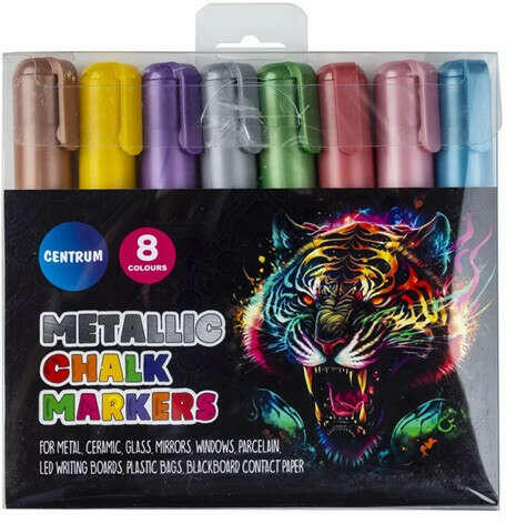 Krétamarker 8 db-os készlet Metál Centrum színes 3-5mm Fedezze fel a krétamarkerek sokoldalúságát ezzel a különleges termékkel, amely tökéletes választás mindazok számára, akik szeretik a változatosságot és a kreativitást. Ezek a markerek kiválóan alkalmazhatók a legkülönfélébb felületeken, legyen szó fémről, kerámiáról, üvegről, tükörről, ablakról, porcel