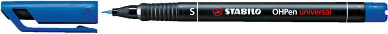 PERMANENT MARKER 0,4MM, STABILO OHPEN S KÉK Vízálló és törlésbiztos. Szinte minden felületen használható; fóliára és sima felületre is. Alkoholbázisú tinta; 3 napig nem szárad ki kupak nélkül. Szellőző kupak. Ergonomikus, csúszásmentes fogórész, PP tolltest. Vonalvastagság: 0,4 mm. Íráshossz: 1300 m. Katalóguskód: 479