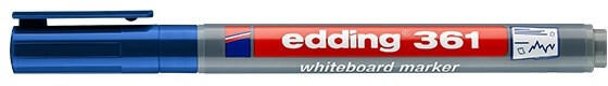 Táblamarker EDDING 361 kék 1 mm Fehér táblára való írásra, rajzolásra alkalmas marker. "Cap-off" festékkel töltve, ezért néhány napig kupak nélkül sem szárad be. Az írás szárazon letörölhető. Kerekített csúccsal. Vonalvastagság: 1 mm.