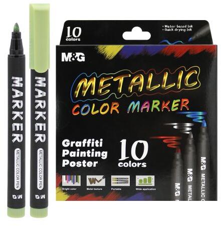 Marker készlet élénk fémes színekkel. Színeket tartalmaz: fehér, arany, piros, kék, bronz, zöld, lila, ezüst, fekete, zöld - óceán Jelölő mérete: átmérője 12 mm, hossza 140 mm