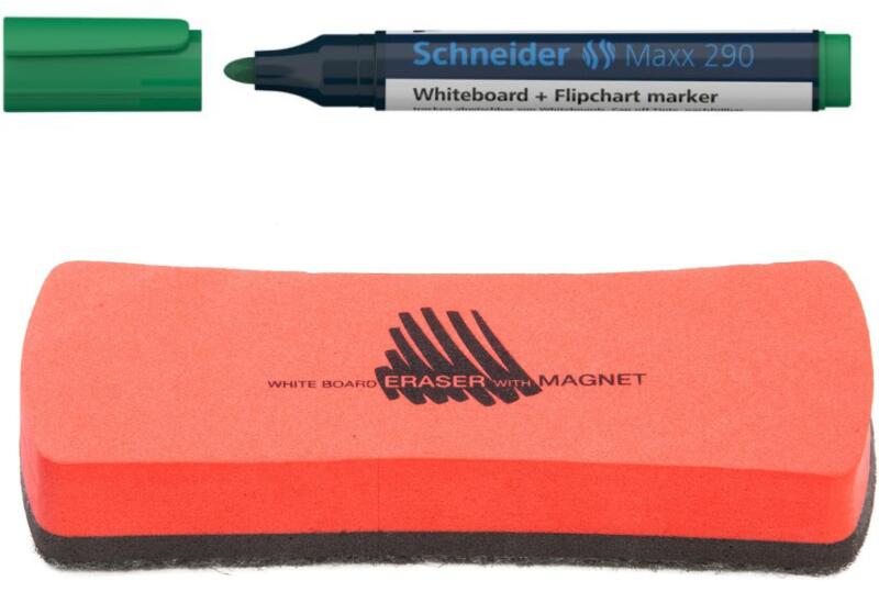 Schneider Táblakészlet, zöld marker és ICO szivacs A Schneider tábla jelölők flipchart papírra is írhatók a speciális tinta miatt, amely könnyen letörölhető a tábláról, és nem látható a flipchart papír másik oldalán. Marker jellemzői:Szagtalan és oldószermentes tintát tartalmaz;Kerek hegy, amely akkor sem szárad meg, ha 2-3 napig fedő nélkül marad;Írásvastagság: