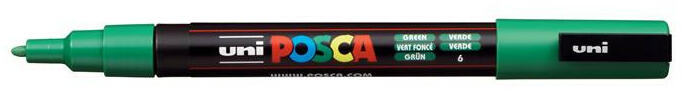 Dekormarker, 0,9-1,3 mm, UNI "Posca PC-3M", zöld - az első titánoxidos nagyfedőképességű, vízbázisú marker - tintája száradás után vízálló, vegyileg nem aktív, tovább feliratozható felületet képez - alkosson egyéniségének megfelelőt papírra, fémre, fára, üvegre, műanyagra, porcelánra, cserépre, textilre - kerekített hegy - a tinta színével megegyező kupak - xil