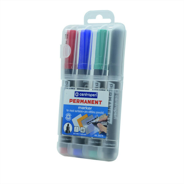 Permanent marker, a legtöbb felületre ír, ellenáll a víznek, a kopásnak, az időjárásnak. Alkohol alapú. A készlet egy kemény műanyag dobozban rendelhető. Vágott csúcs, átmérő 0,5mm. Írás szélesség 1-4,6mm Katalóguskód: 23288
