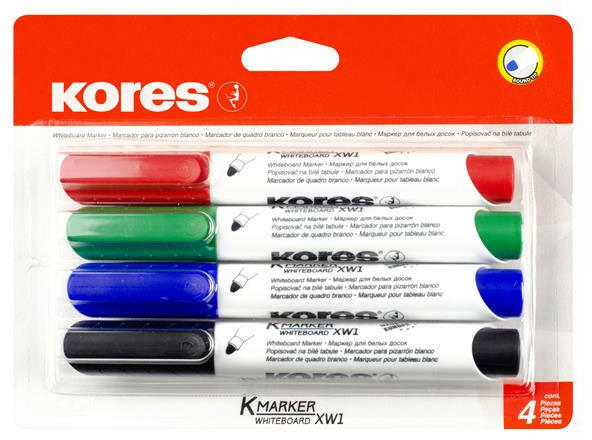 A Tábla- és flipchart marker készlet, kúpos, KORES Eco K-Marker, 4 különböző szín (IK20724) A KORES sokoldalú fehértábla marker könnyű és kényelmes írást biztosít -intenzív színek -kúpos hegy -"Cap off" tinta: 48 órán át nem szárad be kupak nélkül -élénk és áttetsző színek minden fehértáblán -szárazon törölhető nem pórozus felületekről -fehér tábláró