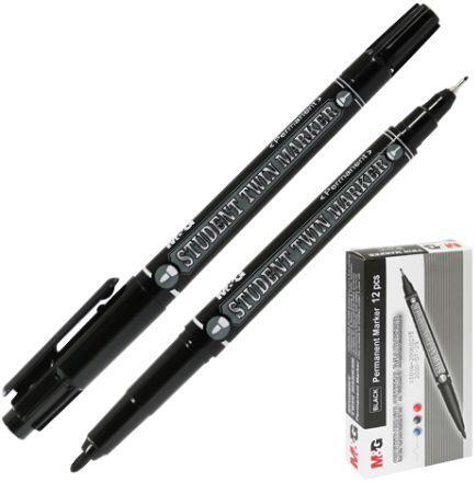 Kétoldalas állandó marker Student Twin Marker M&G. Alkohol alapú tartós tinta, víz- és fakulásálló, gyorsan száradó. Ír papírra, gumira, bőrre, műanyagra, fémre. Extra vékony hegy - nyomszélesség 0,5 mm. Vékony hegy - 1,0 mm nyomszélesség. Szín: fekete.