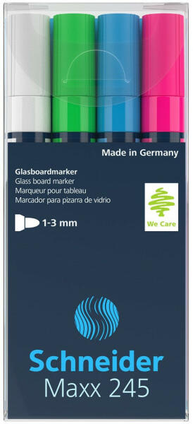 Kerek hegy, ideális üvegtáblák, más üvegfelületek, tükör, ablak dekorálására és írására, alkoholbázisú, nagy fedőképességű, fényálló tinta. Ragyogó, intenzív színek. Szelepes technológiával készül. Katalóguskód: 36366 ÜVEGTÁBLA MARKER 1-3 MM 4-ES KÉSZLET SCHNEIDER MAXX 245 Gyártó : Schneider