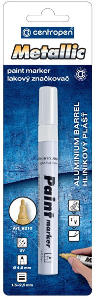 LAKKMARKER 1,5-2,5MM, KEREK HEGY CENTROPEN 9210 FEHÉR Univerzális marker, kerek hegy, 1,5-2,5mm írásvastagság, porózus és nem porózus felületeken is ír. Száradás után víz -, kopás - és időjárásálló. Katalóguskód: 53490