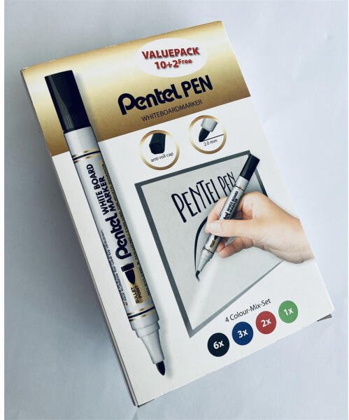 Táblamarker szett 2mm, kerek PENTEL 12db-os klt A Pentel kedvelt MW85 táblamarkerének limitált kiadása nagykereknek, kiskereskedőknek, nagy felhasználóknak. A 12 db-os gyári kisgyűjtőben 6 db fekete, 3 db kék, 2 db piros és 1 db zöld kapott helyet, figyelembevéve a használók általános szín igényét. Katalóguskód: 40995