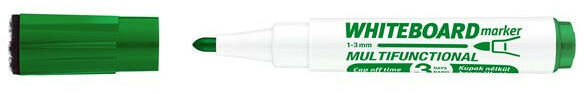 Tábla- és flipchart marker, 1-3 mm, multifunkciós, ICO "Markeraser" zöld - multifunkciós táblamarker, - mágneses fehértáblára való írásra, rajzolásra - néhány napig kupak nélkül sem szárad be - a kupakban elhelyezett mágnes révén acél táblafelületeken rögzíthető - az írás szárazon letörölhető, melyet a kupak végén található táblatörlő korong is segít - ker
