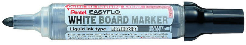Táblamarker 2mm, kerek, utántölthető PENTEL EASYFLO fekete Gömbhegyű, vízbázisú táblamarker. A Folyadéktartálynak köszönhetően folyamatos a tinta áramlás és soha nem szárad ki. Használat előtt rövid ideig tartsa heggyel lefelé a markert. Utántölthető, patron: MWR1. Acryl szálas, mindig alaktartó és strapabíró hegy. 94%-ban újrahasznosított anyagból készült, elem