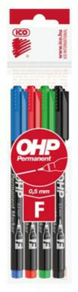 Alkoholos marker készlet, OHP, 0,5 mm, F, ICO, 4 különböző szín (TICOHPFV4) - alkoholbázisú tintával töltött - műanyag, üveg, fém, fa, illetve szinte minden felület feliratozására alkalmas - vékony írócsúcs - gyorsan száradó festék, - írásképe törlés- és vízálló - vonalvastagság: 0,5 mm - a termék 90%-ban újrahasznosított műanyag alapanyagokból készült Gyá