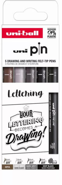 UNI PIN 5 darabos rajzmarker készlet Lettering (Brush Sepia, Brush Light Grey, Brush Dark Grey, Brush Black, fekete rajzmarker: 0,8 mm) A készlet kiváló művésztollakat tartalmaz (különböző vonalvastagságok). A finelinerek fakulásálló Super Ink tintát tartalmaznak, így alkotásaid tartósak maradnak. A finom hegyű toll homogén, tömör és tiszta vonalat hoz létre. A létrehozott