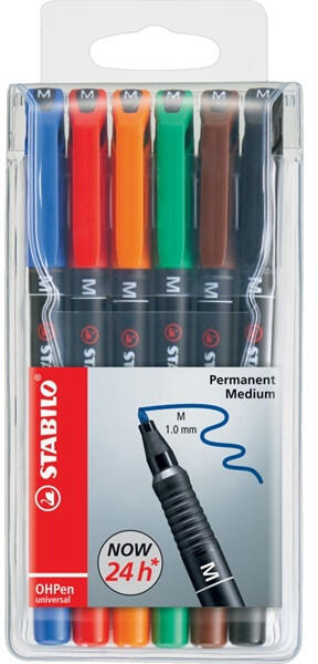 Stabilo OHPen 843 M 6db-os vegyes színű permanent marker készlet - Szinte minden sima felületen használható - Vonalvastagság: 1 mm - Légáteresztő szeleppel ellátott kupak - Hosszú nyitva tarhatósági idő: kb. 24 óra - Szín: 6 színű készlet