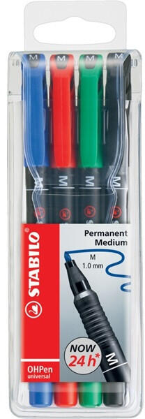 Stabilo OHPen 843 M 4db-os vegyes színű permanent marker készlet - Szinte minden sima felületen használható - Vonalvastagság: 1 mm - Légáteresztő szeleppel ellátott kupak - Hosszú nyitva tarhatósági idő: kb. 24 óra - Szín: 4 színű készlet