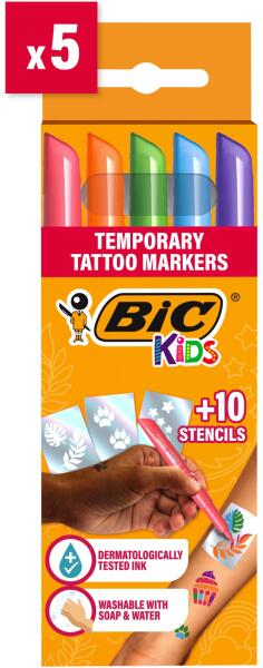 Bic Kids Ideiglenes tetováló készlet, 5 marker, 10 sablon Marker- és sablonkészlet BIC Kids ideiglenes tetoválásokhoz, bőrgyógyászatilag tesztelt illatmentes tintával - 5 + 10 sablonos csomag