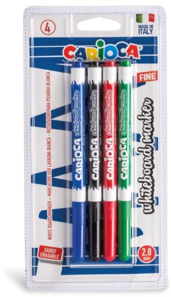 Carioca tábla marker készlet, 4 db A Carioca marker készlet 4 darab 2,8 mm-es hegyű, kék, fekete, piros és zöld színű filctollból áll. Ezek az Olaszországban, a Carioca minőségi szabványai szerint készült filcek tökéletes eszközök a legkreatívabb ötletek illusztrálására. Ráadásul nagyon gyorsan száradnak, sokáig kitartanak és könnyen letörölhetők. 2,8 mm-es hegy;
