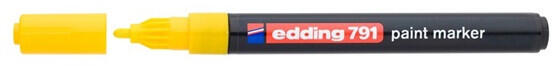 Edding 791 1-2mm sárga lakkmarker - Üveg, porcelán, műanyag, fém illetve szinte minden felület feliratozására, jelölésére alkalmas - Különösen ajánlott szennyezett felületekhez - Kerekített csúcs, műanyag test, permanent, lakkszerűen fedő festékkel töltve - Gyorsan száradó festék, írásképe törlés- és vízálló, magas fény- hő- és törlésálló - Festékadagolá