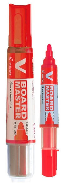 Pilot BeGreen V-Board Master piros táblamarker A Pilot BeGreen V-Board Master egy cserélhető patronos, folyékony tintával töltött táblamarker. Az újfajta tintatovábbító rendszer lehetővé teszi az azonnali írást, rázás vagy pumpálás nélkül. A V-Board Master marker újrahasznosított műanyag felhasználásával készült, mellyel a Pilot csökkenti ökológiai lábnyomát az