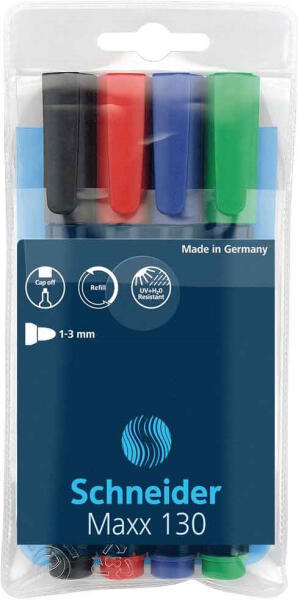 PERMANENT MARKER KÉSZLET, 1-3MM, KEREK HEGYŰ HEGYŰ, SCHNEIDER MAXX 130, 4 KLF. SZÍN Kerek hegy, vízálló szinte szagtalan, gyorsan száradó, minden sima felületre használható, a kupak színe megegyezik a tinta színével. Kupak nélkül 2-3 napig nem szárad be. Katalóguskód: 36341
