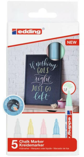 Táblára használható krétamarker. Letörölhető folyékony kréta. Üvegfelületek, ablakok, sötét színű táblák, műanyag felületek és tükrök feliratozására, díszítésére alkalmas vízbázisú marker. Nedves kendővel vagy szivaccsal eltávolítható. Kerek csúccsal. Vonalvastagság: 2-3 mm. 5 db, 4 különböző szín. Az Edding Németország piacvezető rostirón márkája,