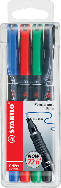 PERMANENT MARKER KÉSZLET 0,7MM, STABILO OHPEN F, 4 KLF. SZÍN Eredetileg írásvetítőkhöz kifejlesztett filctoll alkoholos tintával, csúszásmentes fogózónával. Szinte minden sima felületen alkalmazható, így minden jelöléssel kapcsolatos feladathoz ideális eszköz. 3 vonalvastagság – szupervékony (S: 0,4 mm), vékony (F: 0,7 mm) és közepes (M: 1 mm). Akár 3 napig kupak nélk