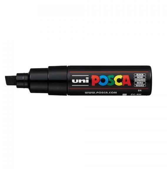 Uni POSCA PC-8K Filc, 8 mm, Fekete A POSCA festékmarkerek kiváló, több felületen használható, kreatív tollak. Az uni POSCA vaskos vágott hegyű festékmarker vízbázisú pigmenttintát tartalmaz, amely fényálló, vízálló, és szinte bármilyen felületre ír. A PC-8K 8 mm széles vágott hegye szép íveket rajzol, és nagy felületeket fed le a színek széles skálájával. A Stre