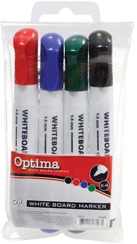 Táblamarker OPTIMA 4db-os készlet Vízbázisú tinta, kerek hegy. Mágneses és flipchart táblára is egyaránt használható. Szárazon törölhető. Írásvastagság: 1-3 mm. Nem mérgező. Kerek heggyel. 4db-os készlet.
