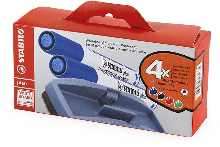 TÁBLAMARKER+TÖRLŐ KÉSZLET 4SZÍN STABILO 6414PM 4db táblafilc + táblatörlő egy készletben. vonalvastagság: 2,5-3,5 mm kerek hegy Katalóguskód: 1647