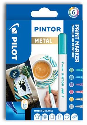 Dekoratív marker a PILOT márkától, a "PINTOR METAL " kategóriába tartozik. Hat metál színből álló készlet, például ezüst, rózsaszín, lila, kék, zöld és arany. A tinta vízbázisú, magas pigmenttartalmú, a jobb és gazdagabb színek érdekében . Teste hatszög alakú a hatékonyabb fogás érdekében. A marker minden lehetséges felületen használható. A csomagoláson egyé