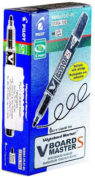 Pilot BeGreen V-Board Master S 10 db/csomag kék táblamarker Újratölthető, így gazdaságos és környezetbarát. Folyamatos tintaáramlási rendszere miatt írásképe állandó minőségű az utolsó csepp tintáig! Könnyű letörölni, a tinta nyom nélkül eltűnik. A BeGreen V-Board Master S marker újrahasznosított műanyag felhasználásával készült, mellyel a Pilot csökkenti öko