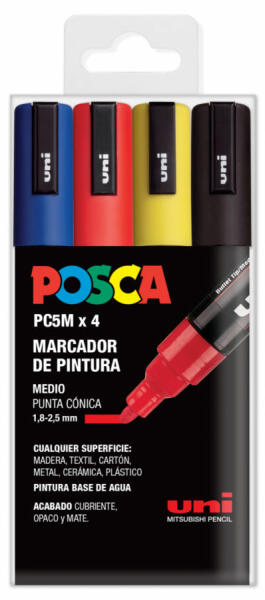 Posca PC-5M marker A készlet színei: kék, piros, sárga, fekete Sokoldalú - 1,8–2,5 mm-es hegyével a PC-5M széles használati szabadságot kínál. Többcélú - Ideális porózus, szabálytalan felületek, például fa, kő, beton stb. Kiterjedt - A kínálat legszélesebb színválasztékában kapható: közel 40 árnyalatban, ebből 4 fluoreszkáló és 8 metál. Kényelmes - A hegye k