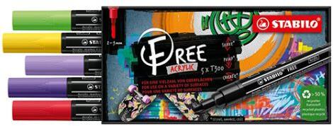 A STABILO FREE Acrylic Marker termékcsaláddal szinte korlátlanul tervezhet és személyre szabhat. A markerek három, gondosan kiválasztott tokváltozatban és akár 20 borítószínben kaphatók. Átlátszatlan és fényálló pigmentált akrilfesték, amely szinte minden felületre alkalmas, a papírtól a kőig a kerámiáig, műbőrig és fáig. Mindenki szabadjára engedheti kreativitás