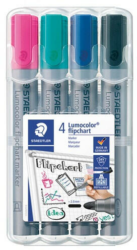 Táblamarker Staedtler Lumocolor flipchart kerek 4 db-os klt. (pink, türkiz, kék, fekete) 4 darabos, kerek hegyű flipchart táblamarker készlet deális papíron történő használatra, mivel a tinta nem üt át Intenzív színű, enyhe szagú Pár másodperc alatt szárad, ezért ideális balkezes felhasználók számára DRY SAFE technológia: napokig kupak nélkül tárolva sem szárad be R