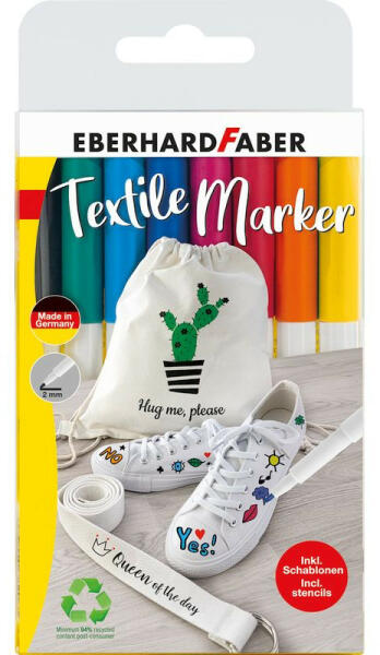 Ragyogó színű textílfilcek mellékelt sablonnal. A filctoll hegye tökéletes kis motívumokhoz és nagyobb területekhez is. Maximum 60°C-on mosható. Száradási idő 24 óra, vagy vasalás (gőzölés nélkül) után használható.